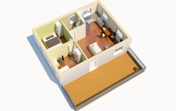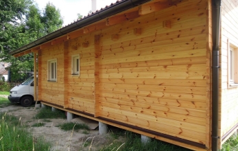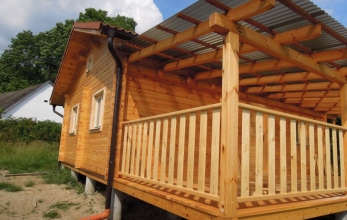 Srubová přízemní chata o rozměrech 6 * 8,3 m s terasou o rozměrech 3 * 8,3 m.